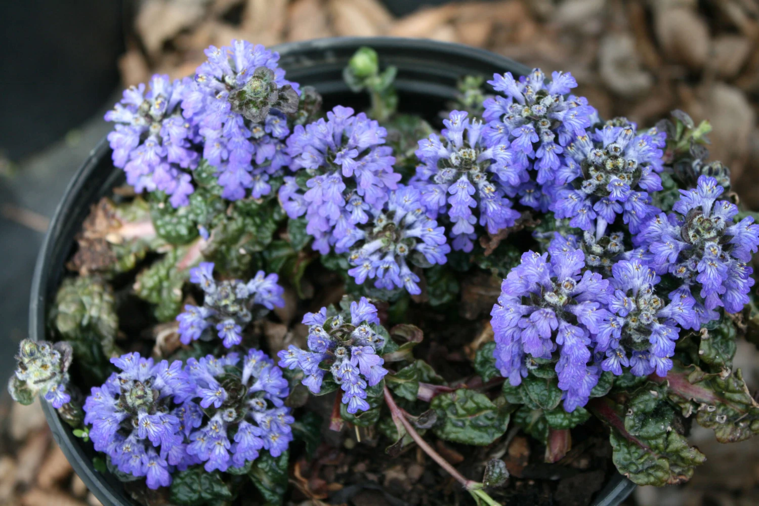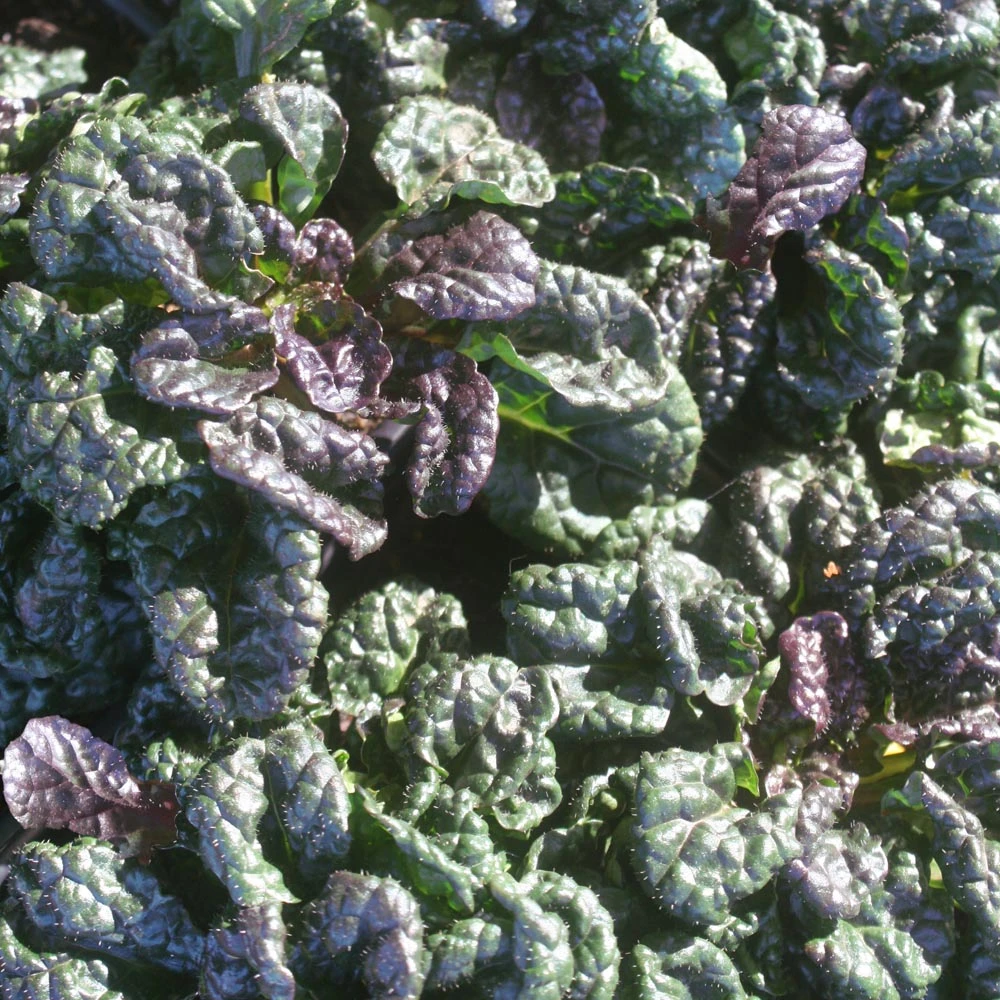 Ajuga pyramidalis ‘Metallica Crispa’ has extremely crinkled and twisted shiny, dark green to maroon leaves. ‘Metallica Crispa’ Bugleweed is very compact with short spikes of blue flowers in spring to early summer. Plant Ajuga ‘Metallica Crispa’ in a container where its unusual foliage can be fully appreciated.