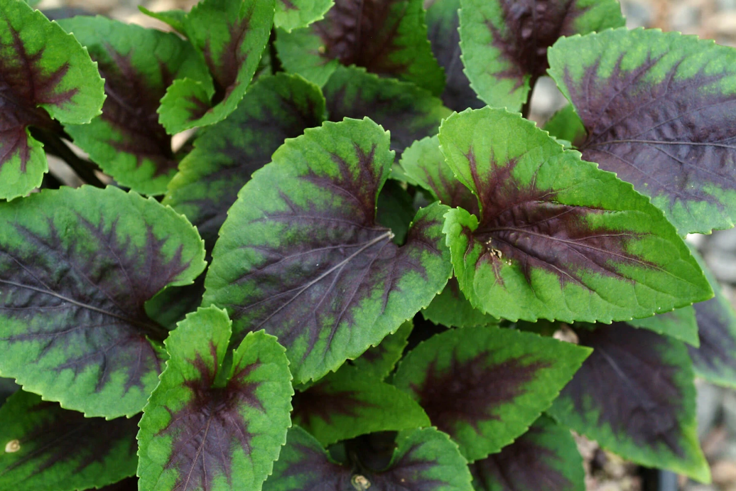 Viola x koreana ‘Heartthrob’ has bright green heart shaped leaves with large burgundy centers and lightly serrated edges. Its early spring blooms are violet pink, starting before the new leaves appear, but the real show is the foliage. A perennial Violet, Viola ‘Heartthrob’ forms clumps and does not self sow. It is nice edging a shady border or in containers.